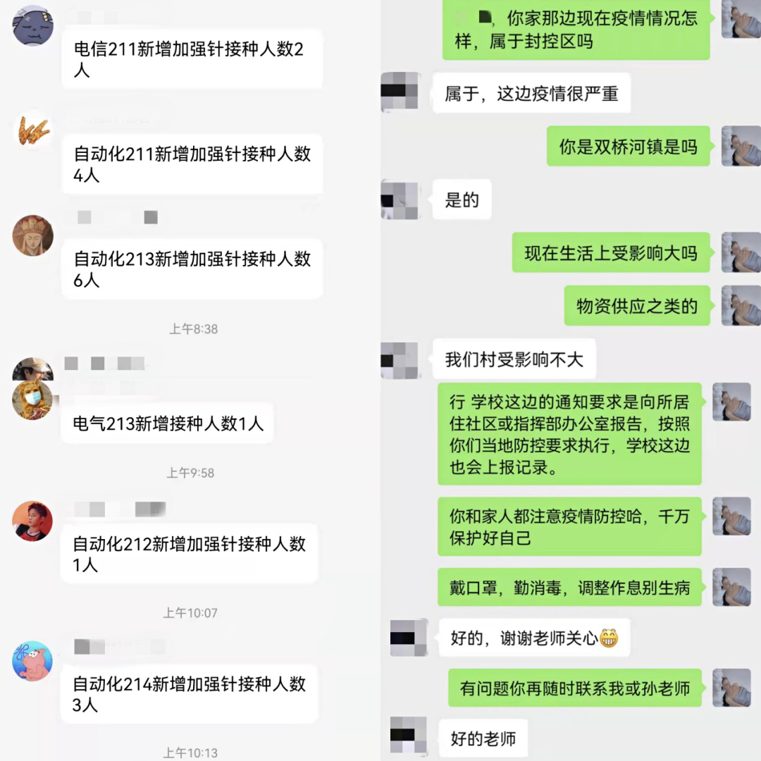 用心用情,以生为本,写好安全教育“假期篇”。学院严格落实学校疫情防控要求,督促学生每日健康打卡,关注返乡学生尤其是中高风险地区学生健康状况,建立班级疫苗接种台账并实行周更新制,引导学生应种尽种加强针,做好居家防控;加强人文关怀,落实资助育人,开展2022年寒假“暖冬”线上走访活动,了解家庭经济困难学生情况,宣讲资助政策,深化“扶贫”与“扶智”有机结合,实现“AI平安”学生工作增温提效。