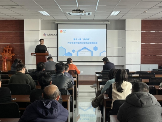 杨奉儒深入解读了“挑战杯”赛事组织政策,并热情鼓励大家积极指导学生参与这一赛事。他着重指出,“挑战杯”这一赛事不仅是学生展现创新与实践的舞台,更是实践教育创新改革成果的关键平台。正是通过“挑战杯”这一平台,学生们得以将理论知识巧妙地转化为解决实际问题的利器,这一过程无疑将成为他们培养创新思维、锤炼团队协作技能的宝贵磨砺。与此同时,对于广大教师而言,“挑战杯”同样是一个不可多得的窗口,透过它,教师们得以更加深入地洞察学生的学习需求与兴趣所在,从而更加精准地调整和优化教学策略与内容。最后,杨奉儒详细阐述了比赛规则、流程及评审标准,为老师们提供了清晰的认识框架。